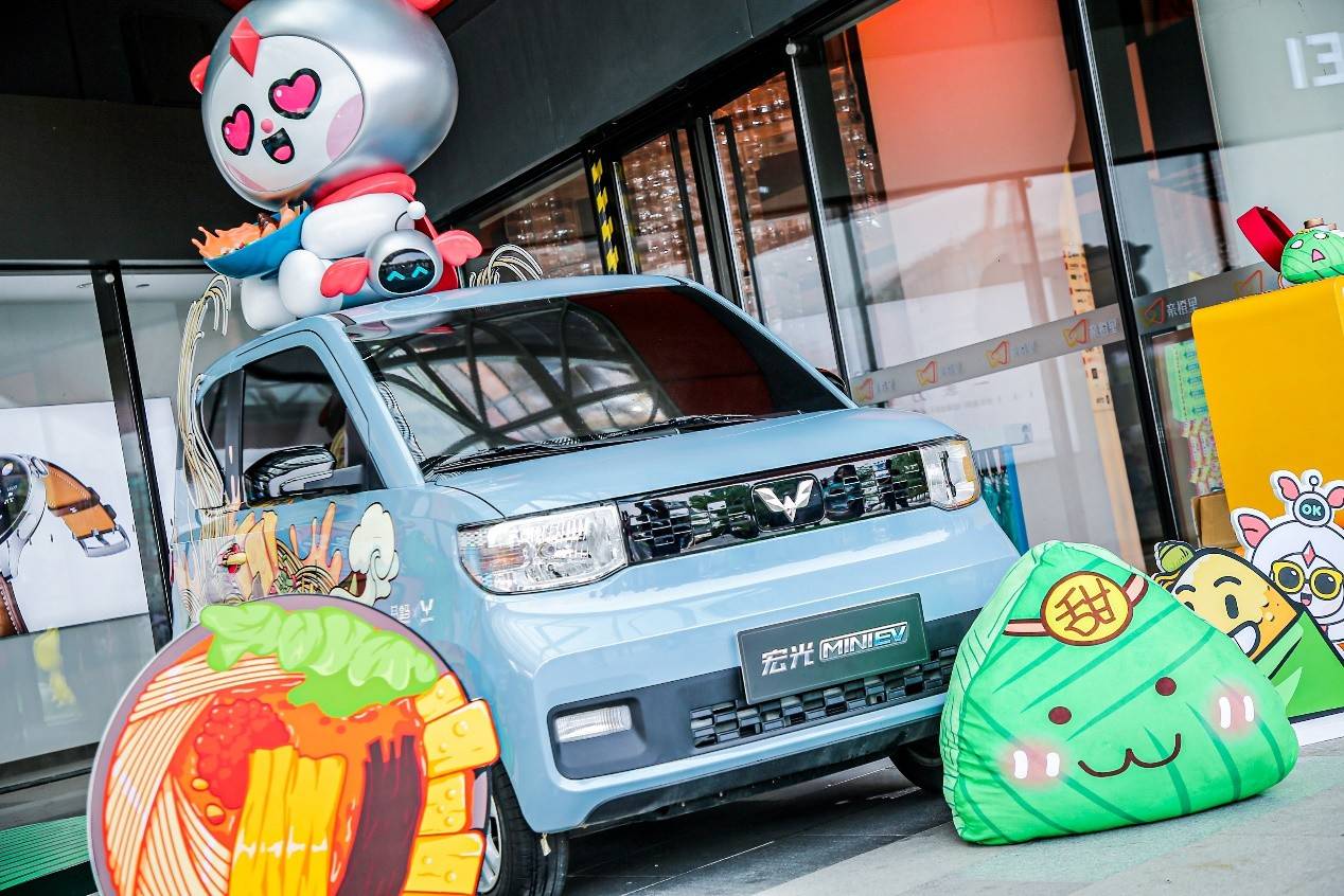 在上海、杭州快闪现场,刚刚夺得四月全球新能源乘用车销量第一的宏光MINIEV再次进击,以灵动潮变的魅力奉送端午节日祝福。宏光MIINIEV身着“盒马先生”卡通图案车衣,萌动“营业”。涂装螺蛳粉粽子车贴的宏光MINIEV,携手五菱活力体验官小五与小菱,为人们呈现端午节日乐趣。