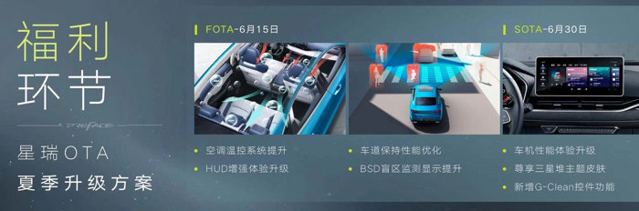 另据悉,除了加推“时空版”新车型,根据前期用户的反馈需求,本次吉利星瑞还带来了OTA夏季升级福利,公布将于6月15日对FOTA进行升级,其升级内容为车道保持性能优化、HUD增强体验升级、空调温控系统提升、BSD盲区监测显示提升等;同时还将于6月30日对SOTA进行升级,主要升级在车机性能体验升级,新增尊享三星堆主题皮肤和G-Clean控件功能,进一步提升用户的驾乘体验,常用常新。