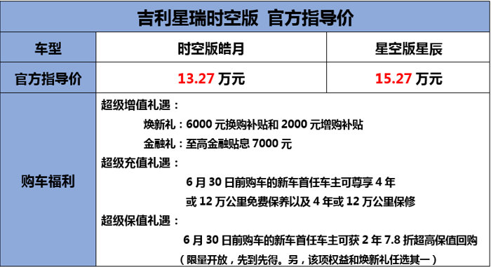 2021年6月11日晚,吉利星瑞“时空版”在位于成都的吉利学院,举行了上市发布会。新车分为时空版皓月和时空版星辰两款车型,官方价分别为13.27万和15.27万。由此,星瑞在售车型也增至7款,使得整个产品线和价格区间更加丰富。