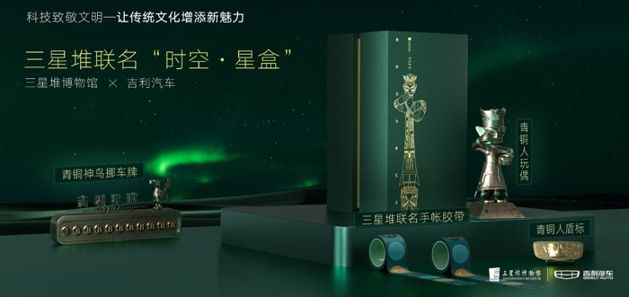 2、发布吉利汽车X三星堆博物馆联名“时空·星盒”,设计融合三星堆文化,套组包含青铜神鸟挪车牌、青铜人盾标等,将免费赠予星瑞用户。