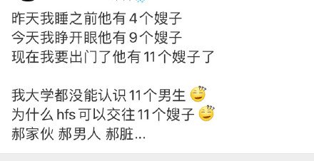 还没等大家缓过劲来,嫂子就像雨后春笋,一个接一个冒出来。当晚冒出来四个,已经惊呆吃瓜群众。没想到第二天一大早,变成了九个、十一个,最终扒出来13个,也有说14个的。但我们没看到姓名,严谨点,保守定为13。