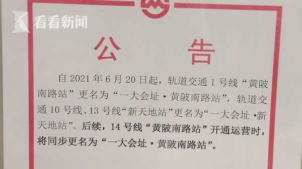 今天上午,记者来到地铁1号线黄陂南路站,从2号口进入车站,四幅大型的红色灯箱广告尤为醒目,这是地铁为庆祝中国共产党成立100周年所8特别制作,在站台层上,记者看到站名图上已经更改为“一大会址·黄陂南路站”。而在新天地地铁站,目前更名的工作也已经在推进中,公告栏张贴了关于更换站名的公告,上面显示从6月20日起,10号线13号线新天地站更名为一大会址“一大会址.新天地站”,届时,所有的指示牌,引导标志等都将更换一新。