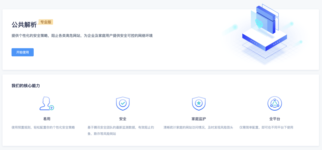 1. 访问 DNSPod 控制台 https://console.dnspod.cn/publicdns/,选择开始使用;如果还没有腾讯云账号,请先行注册。