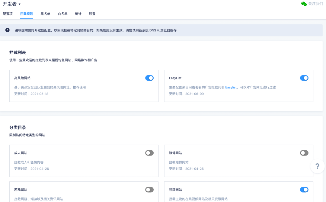 A:是的,我们和腾讯安全团队合作,会获得最新的风险网站数据,用于更新拦截规则。当然,我们也会提供一些网络流行的网站过滤规则,比如本次提供的 Easylist,后续还会持续新增。