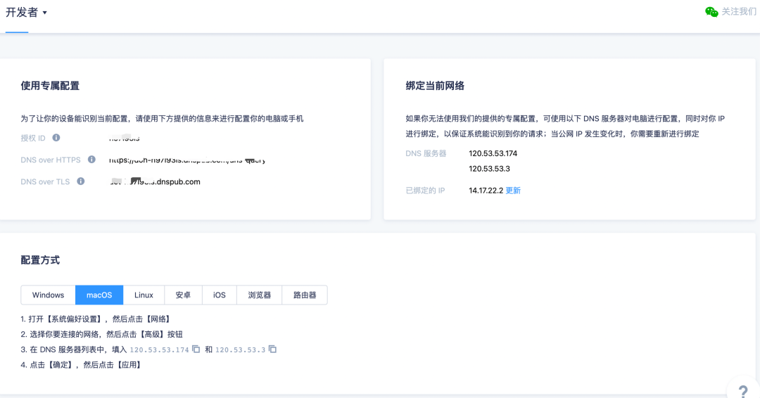 3. 查看配置项,在这里选择一种接入方式来配置到你的设备上,推荐使用 DOH 方式,直接配置到浏览器上即可;如果还想使用传统的 DNS 方式,则需要先将你的公网 IP 进行绑定,然后再使用系统提供的 DNS 服务器 IP 进行配置。
