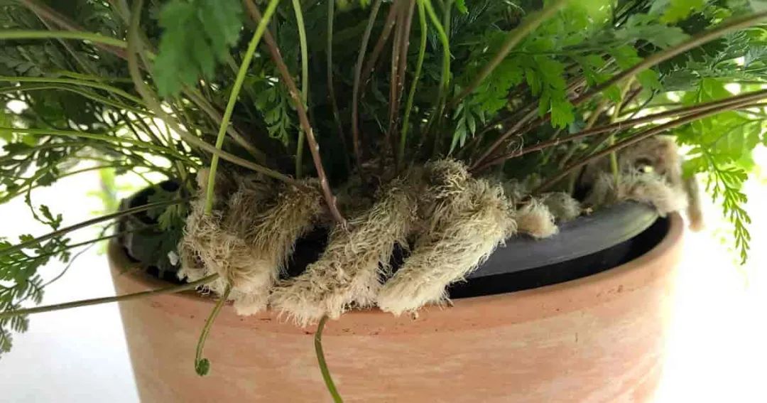 狼尾蕨最大的特点并不是翠绿的叶子,而是那白色毛茸茸的肉质根状茎,它的这些肉质根茎会从土面长出来,爬满整个花盆。