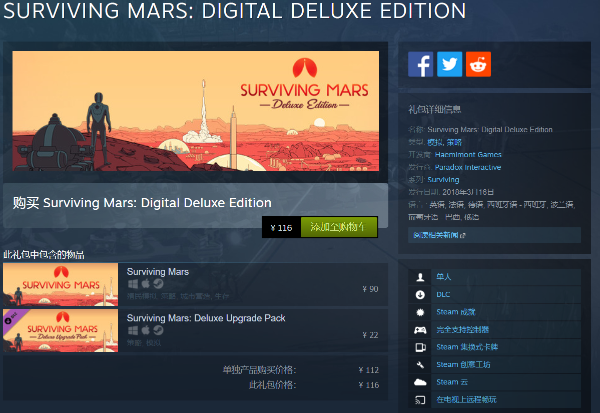 IT之家了解到,《火星求生 豪华版》在 Steam 平台的定价为 116 元,支持中文字幕,是一款科幻城市建造游戏,专注于在火星建立殖民地,并在此过程中努力求生。