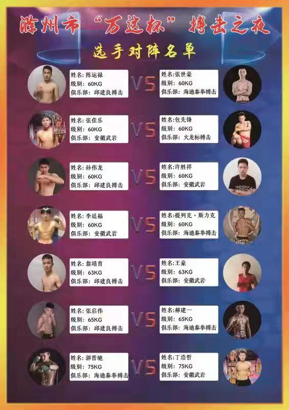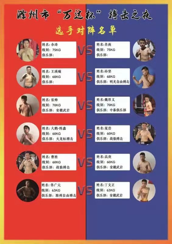 本次比赛滁州搏击协会、明光搏击协会、滁州火龙标搏击、合肥散打体院、徐州战狼、蚌埠邱建良俱乐部输送了大批搏击选手,他们虽未声名远扬但却代表着搏击未来,而最为瞩目的则是年过半百的老将孙坚的比赛,孙坚打法强硬,曾多次获得比赛胜利,与年轻人同台竞技,薪火相传,他不仅展现出搏击精神,更身体力行传播着搏击文化,站在擂台上的他证明着对理想望而却步的不是年龄而是不在年轻的心,只要心中还有激情,人生的擂台就因你热血