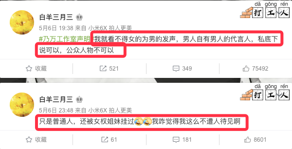 随后,网上关于「乃万事件」的讨论愈演愈烈,「性别对立」的口水战也愈演愈烈,甚至发展到人身攻击和网暴的层次,有一个名叫「白羊三月三」的患癌的女网友,仅仅因为在网上表达了公众人物不应该在公共场所进行站队,就被男网友围攻。