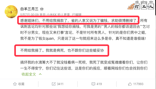 因为患病的原因,该女网友曾发起过求助,而在这事件发生后,她的筹款计划全遭到某些男网友的恶意举报,导致她最终筹款计划被迫取消,甚至有很多男网友对她进行唾骂和谩骂,这些话简直令人目瞪口呆。最后导致,该患癌女网友发文表示不用给她钱,即使是病死也绝对不会妥协,足以可见这场网络暴力对她的冲击和打击。