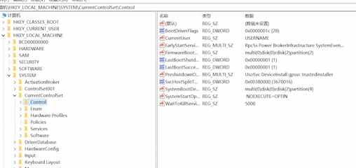 2、打开文件夹HKEY_LOCAL_MACHINESYSTEMCurrentControlSetControl,看右侧是否有“StorageDevicePolicies”