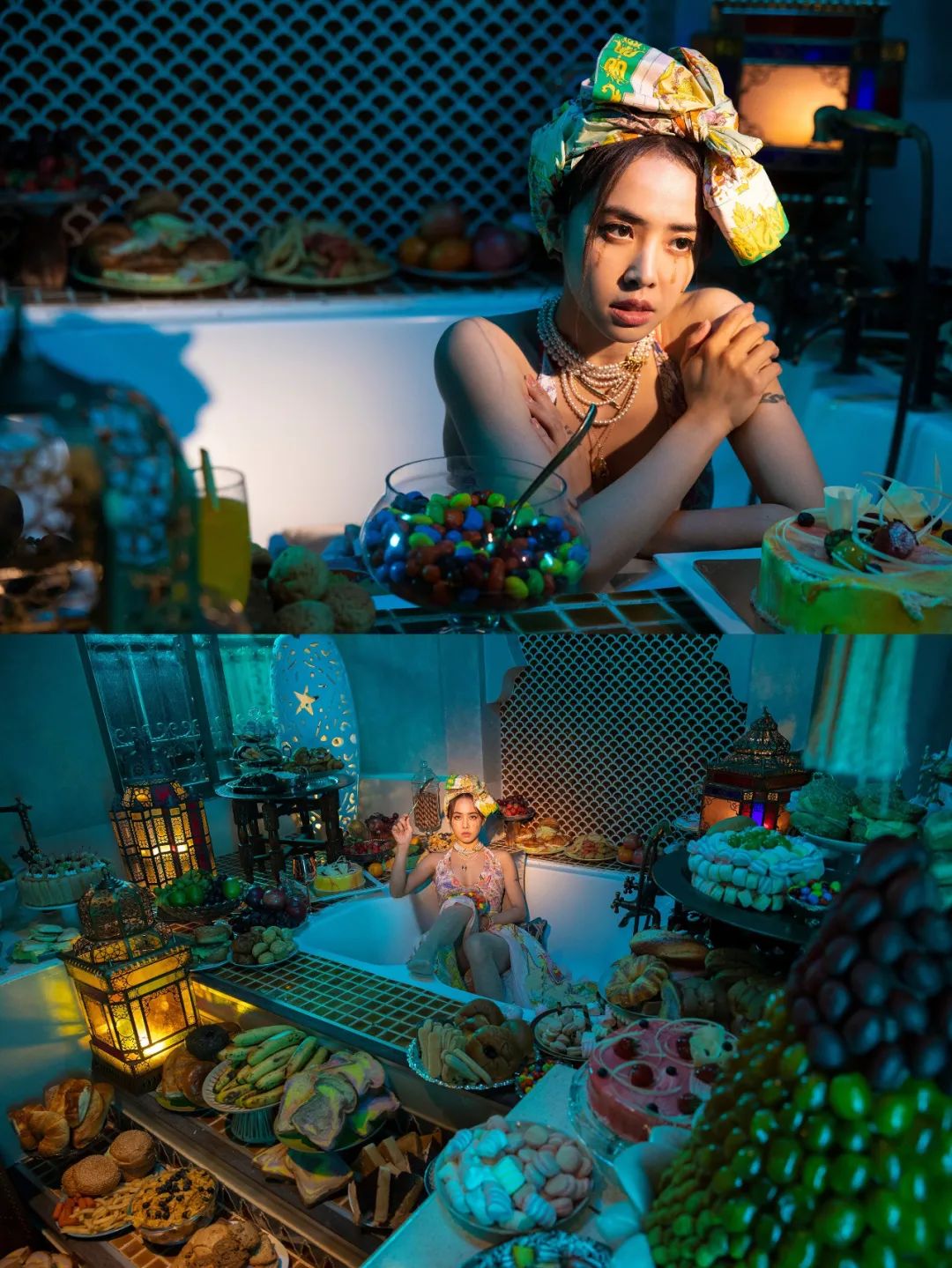 蔡依林浴室一身挂脖珠光海洋女神装搭配落泪妆容,同样来自意大利品牌Etro,楚楚动人。