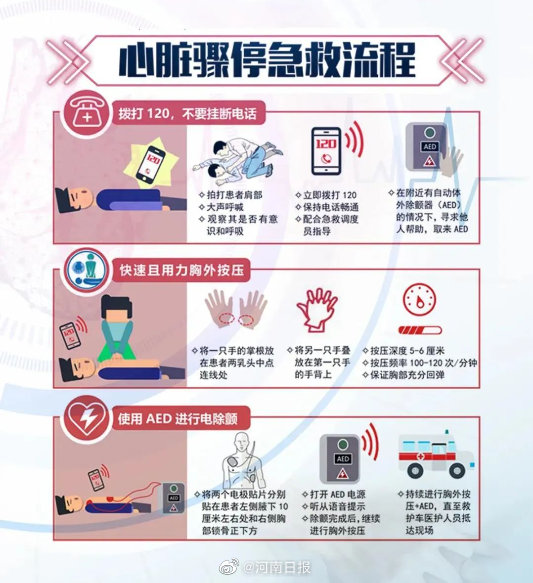 【心脏骤停“三步抢救法”图示】心脏猝死也叫心脏骤停,分为院外心脏骤停和院内心脏骤停,而大部分的病人的心脏骤停发生在院外,因此,一旦出现心脏骤停,大家要切记“黄金救治4分钟”,即在患者倒地后的4分钟内进行心肺复苏抢救。这里有专家推荐的“三步抢救法”,快来看看吧。(记者 王平)