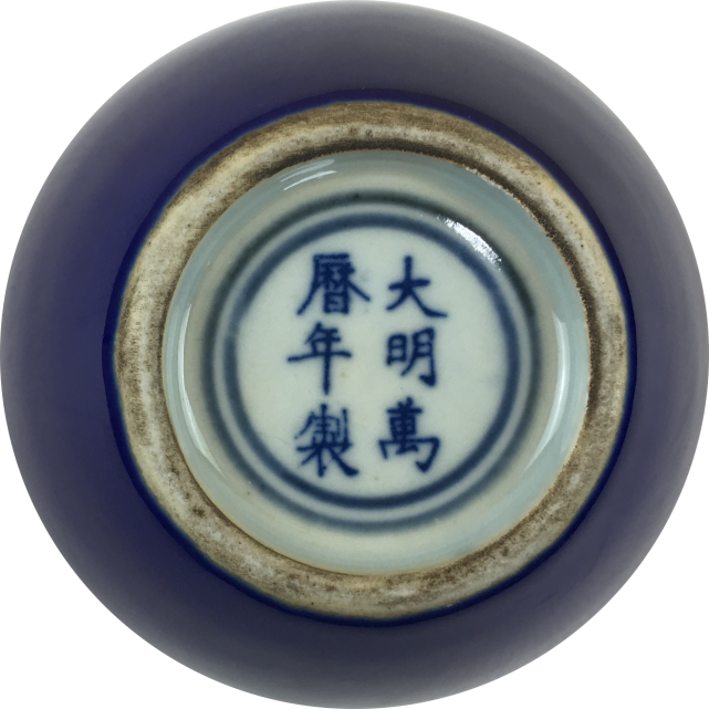 万历所烧的霁蓝釉,色调纯正艳丽,酷似蓝宝石的颜色,因此又名宝石蓝,与红釉、甜白并称为宣德时期三大高温单色釉品种,历来即享有很高的声誉,传世品较为少见。