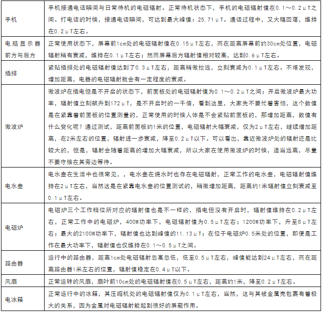 电磁辐射已被世卫组织列为继水源、大气、噪声之后的第四大环境污染源,成为危害人类身体健康的隐形杀手,长期且过量的电磁辐射会对人体生殖、神经和免疫等系统造成伤害,诱发各种疾病。随着现代科技的发展,众多家用电器、办公电子以及手机电脑等已经成为电磁辐射的最大的来源。常见电器的电磁辐射测试可以肯定的是,我们的日常生活中充斥着众多电磁辐射。电磁辐射工频段的单位是μT(T:特斯拉,磁感应强度的单位,描述磁感应强度大小,μT即微特斯拉),数值越小,说明该处的电磁辐射强度越微弱。