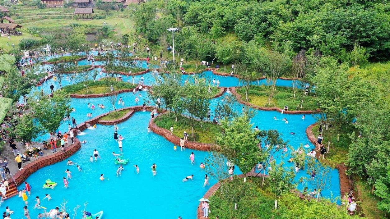 欢乐田园内的天空之镜、浪漫之路,以及火烈鸟、小黄鸭等网红感十足的网红泳圈浮床散布在紫薇叠溪,也成为年轻人们拍照打卡地。也有不少游客来到丛林穿越、彩虹滑道,或是挑战浮力吊桥、水上攀爬等惊险又刺激的野趣戏水玩法,体验不一样的耍水乐趣。