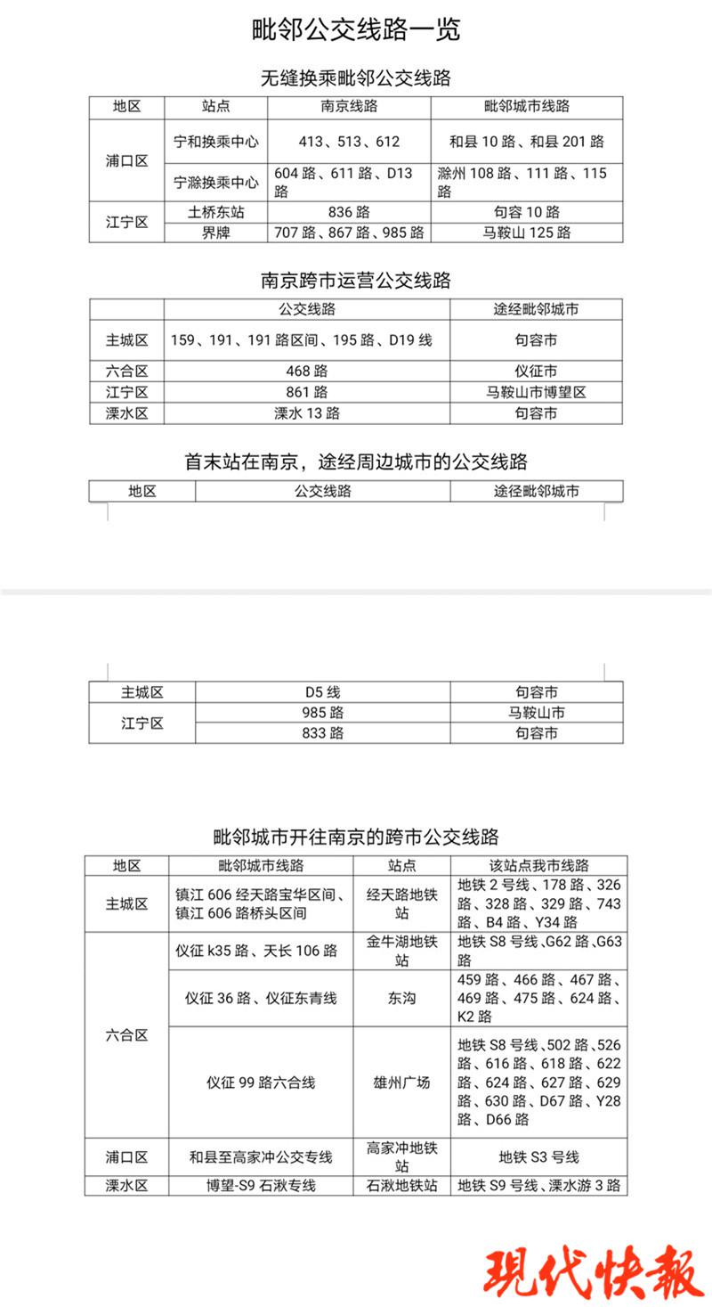记者了解到,在毗邻公交的发展中,南京市交通运输局主动对接周边毗邻地区交通运输部门,了解需求及发展意向,先后在滁州南谯区建成了宁滁换乘中心、马鞍山和县建成了宁和换乘中心,推动了相关地区毗邻公交的高质量发展。北部安徽滁州的汊河、南部安徽马鞍山的博望、东部镇江的句容等毗邻地区也积极推进与南京的协同发展、一体化发展。先后开通了马鞍山博望区至南京 S9 石湫站的专线公交、扬州主城区至金牛湖地铁站的 K35 路公交、仪征至雄州广场的 99 路公交、天长至金牛湖地铁站的 106 路公交等。目前,扬州、滁州、马鞍山等地级市及和县、句容、仪征、博望、当涂等县级行政区主城区的市民可以方便地坐着公交到达南京。