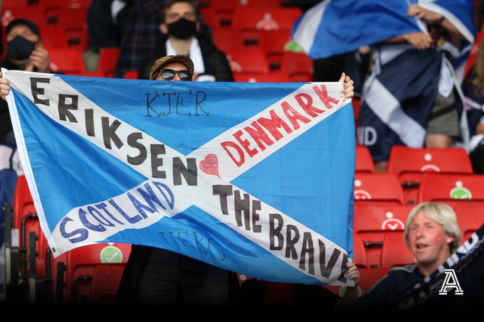 苏格兰球迷祝福埃里克森,并称颂丹麦队长克亚尔为英雄。