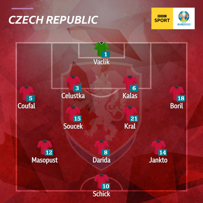 捷克首发:瓦茨利克、切卢斯特卡、曹法尔、卡拉斯、达里达、希克、卢卡什·马索普斯特、扬克托、绍切克、博日尔、卡拉尔。