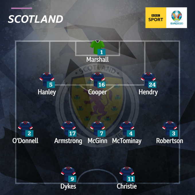 本场苏格兰首发:马绍尔、奥唐奈、罗伯逊、麦克托米奈、格兰特·汉利、麦金、戴克斯、克里斯蒂、库珀、阿姆斯特朗、杰克·亨得利。