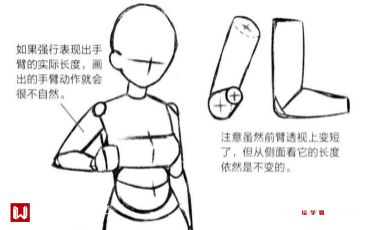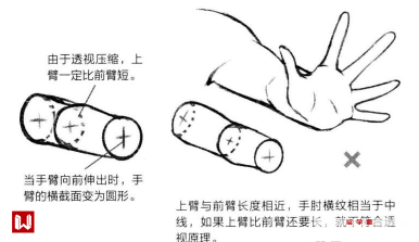 由于透视压缩的原因,角色人物的上臂通常会比前臂短一些。在手臂向前伸的情况下,手臂的横截面会是一个圆形(见左图)。如果上臂的长度比前臂长一些,那么则是错误的(见右图)。