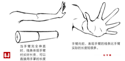 如果手臂处于伸直的情况下,线条的长度则表示了角人物角色手臂的实际长度,这里我们可以直接用手掌的长度来测量前臂和上臂的比例(如下图左)。这里把手臂伸向前方,然后自己手臂的线条没有比实际线条短很多。(如下图右)。