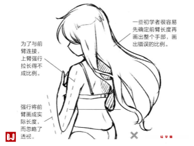 如果我们强制性的绘制出手臂的实际长度,那么绘制出来的成品会很不自然(如下图左)。这里要注意,虽然前臂透视上变得短了一些,但是侧面看长度不变(如下图右)。