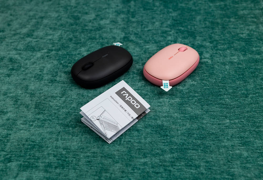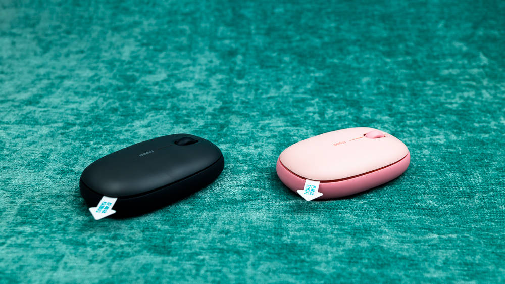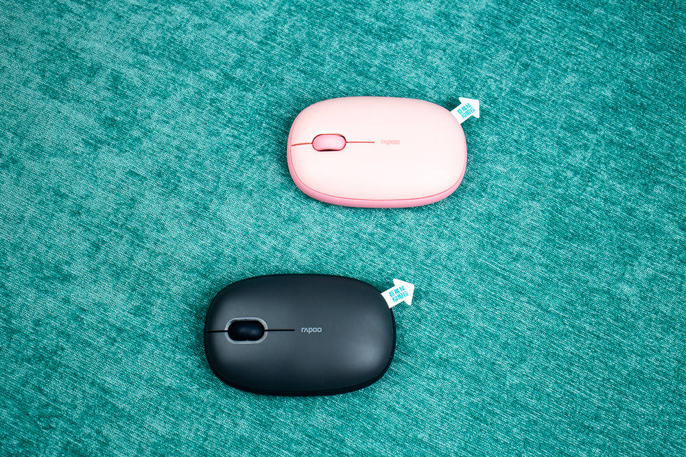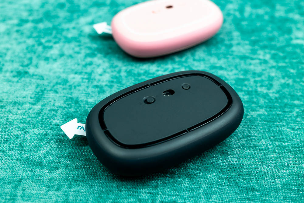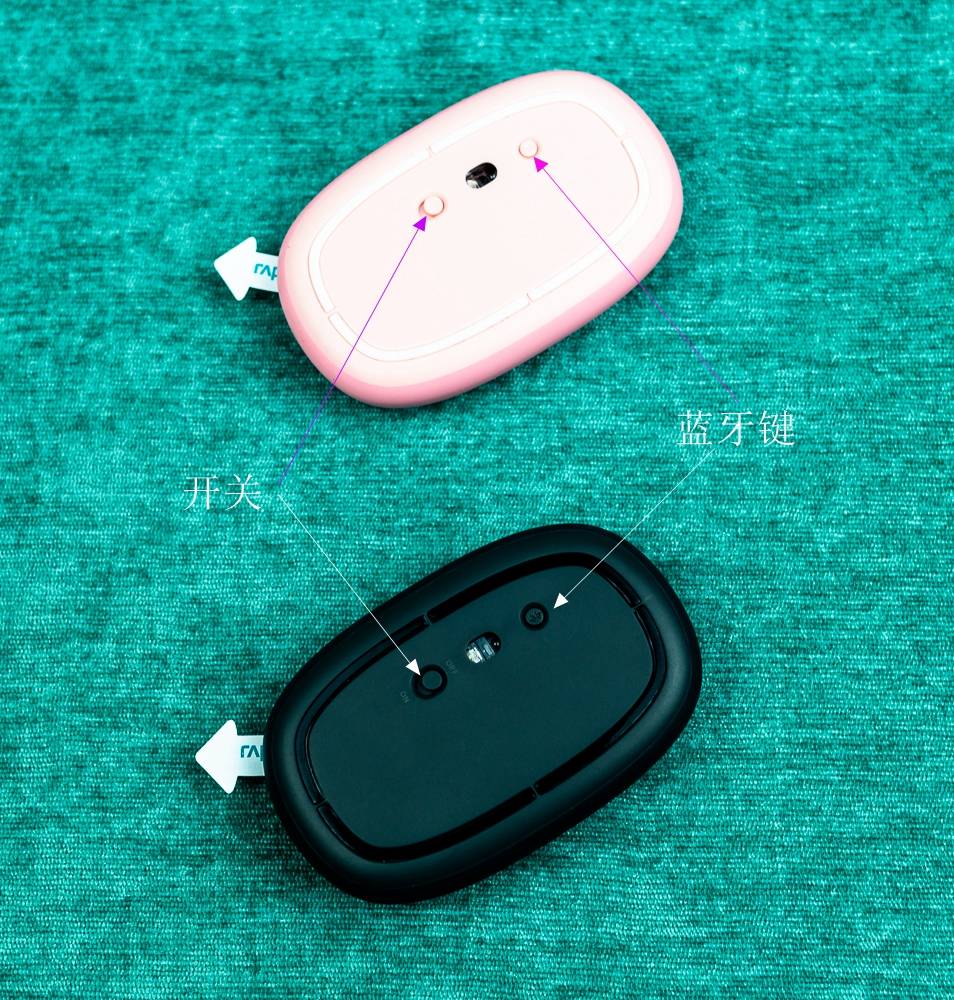 粉色款的鼠标有个萌萌的昵称,叫蜜桃布丁,淡粉色的色调带点小温柔,又元气满满,颇有少女般清新俏皮的感觉。浓郁深灰色的则叫芝麻布丁,芝麻的灰色调很调和,可与各种颜色搭配,这种百搭的颜色,显得深沉成熟,反而更符合男生的气质。无论是粉色款的蜜桃布丁还是黑色款的芝麻布丁,整体的设计都非常的简约、清新,也非常萌,这种萌萌的感觉,恰恰是最新的时尚所在。鼠标采用的是对称设计,所以无论是通常的右手习惯还是少见的左手习惯,都可以方便使用这款鼠标。这款鼠标长100.1mm,宽63.7mm,高26.5mm,重约60g(不含电池),采用光学引擎,分辨率1300DPI,具有左键,右键,中键(滚轮),以及位于鼠标底部的蓝牙键。从鼠标顶部看,可以位于鼠标背部的RAPOO的英文LOGO,正对着中线的开叉,鼠标的滚轮位于中线的正中,两边分别是左右键。还可以看到有一个标签,上有“巨能扯,放胆拉”的字样,其实这个是电池隔开的一个塑料标签,将这个标签拉出来以后,干电池才能和鼠标内部的电池仓的正负极连接,才能给鼠标供电,但是这个标签上的字,确实有点逗。