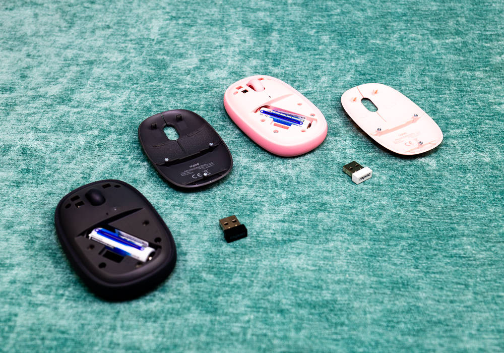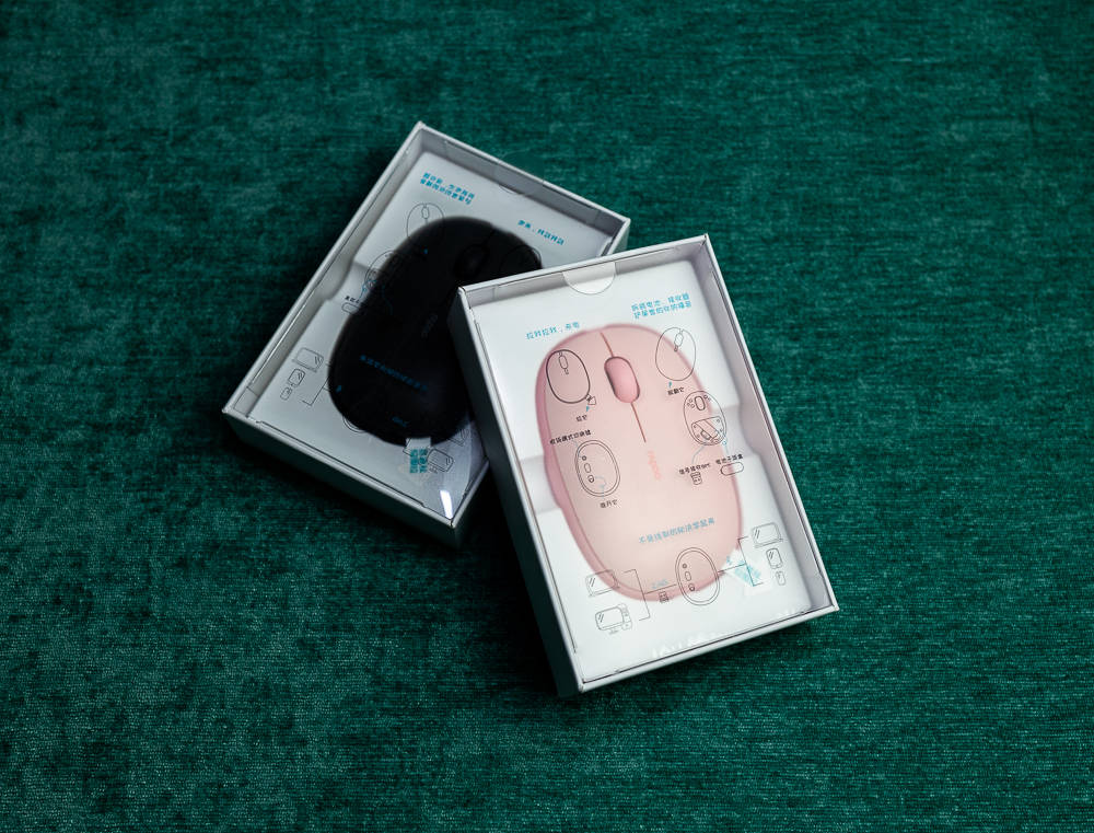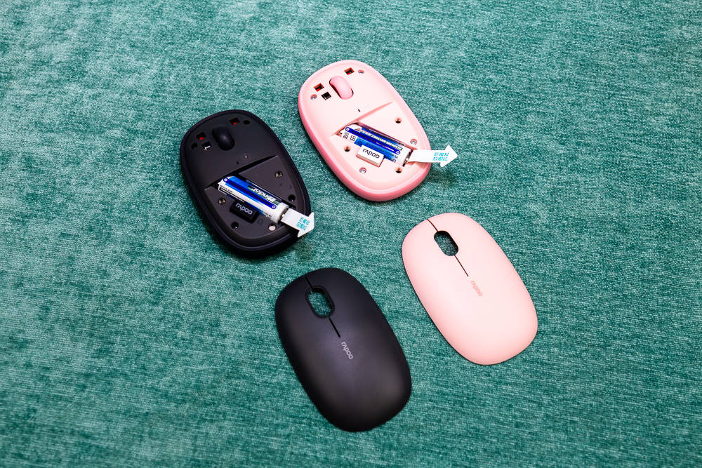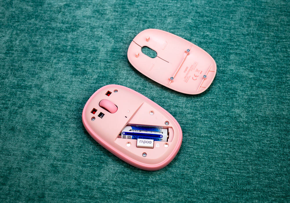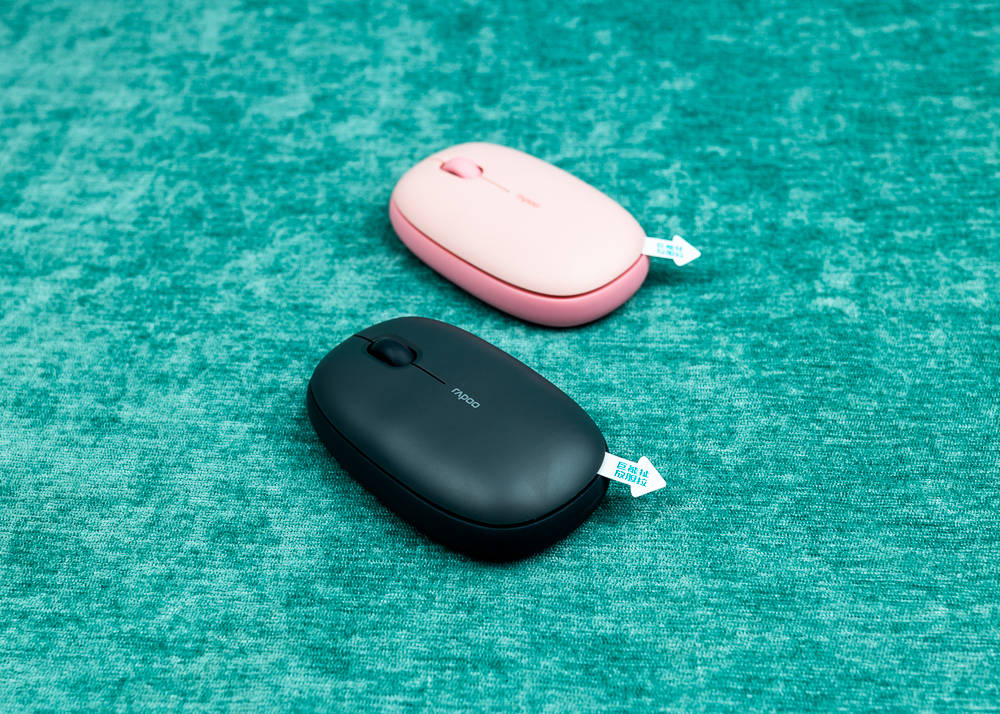 粉色款的鼠标有个萌萌的昵称,叫蜜桃布丁,淡粉色的色调带点小温柔,又元气满满,颇有少女般清新俏皮的感觉。浓郁深灰色的则叫芝麻布丁,芝麻的灰色调很调和,可与各种颜色搭配,这种百搭的颜色,显得深沉成熟,反而更符合男生的气质。无论是粉色款的蜜桃布丁还是黑色款的芝麻布丁,整体的设计都非常的简约、清新,也非常萌,这种萌萌的感觉,恰恰是最新的时尚所在。鼠标采用的是对称设计,所以无论是通常的右手习惯还是少见的左手习惯,都可以方便使用这款鼠标。这款鼠标长100.1mm,宽63.7mm,高26.5mm,重约60g(不含电池),采用光学引擎,分辨率1300DPI,具有左键,右键,中键(滚轮),以及位于鼠标底部的蓝牙键。从鼠标顶部看,可以位于鼠标背部的RAPOO的英文LOGO,正对着中线的开叉,鼠标的滚轮位于中线的正中,两边分别是左右键。还可以看到有一个标签,上有“巨能扯,放胆拉”的字样,其实这个是电池隔开的一个塑料标签,将这个标签拉出来以后,干电池才能和鼠标内部的电池仓的正负极连接,才能给鼠标供电,但是这个标签上的字,确实有点逗。