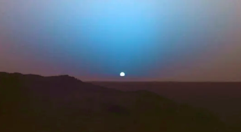 1 火星落日是蓝色的,这是因为太阳下山时,光线要到达地面必须要穿过更多的、富含尘埃的低层大气才能抵达,而在这个过程中,落日的大部分红光就会被散射掉。