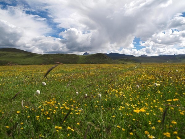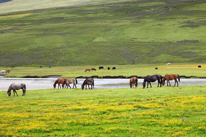 7月正是草原的黄金季节,走进草原,会被满目青青的草地吸引,被五彩野花所诱惑,发源于海子山的无量河从草原中部穿过,十数条大小支流在草原上流趟、注入干流,河两岸分布着无数沼泽湿地。