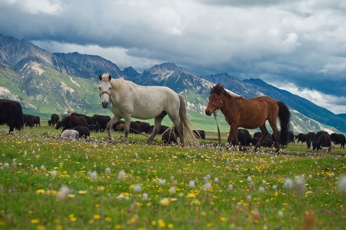 夏日,湛蓝的晴空下,牛羊成群,绿草连天,盛开的野花姹紫嫣红,打一个滚就是一身花香;秋天,晴空高远,云朵洁白,草木金黄;冬日则是白雪皑皑,原驰蜡像。季节的变化赋予大草原无边的神韵与风姿。