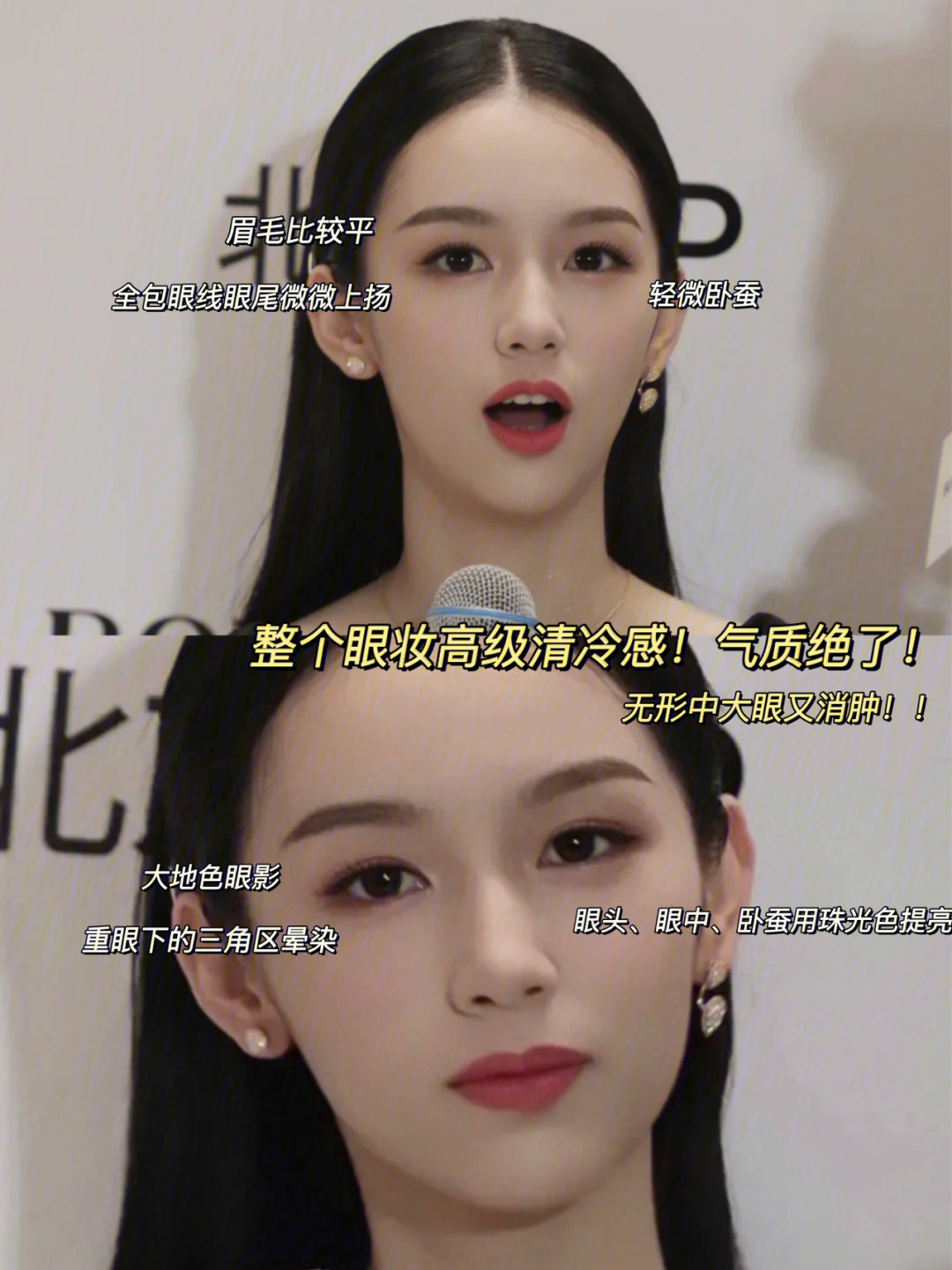 全包内眼线+微上扬外眼线,轻微卧蚕让不会太夸张,整体妆容日常又消肿。