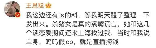 很快,王思聪也做出了快速反应,说要曝孙一宁的黑料,称对方是杀猪女,不但满嘴谎言,还同时和好几个人谈恋爱,甚至在恋爱期间还勾搭过他,就是个直播圈钱的捞女。还联系了媒体整理资料曝出来。