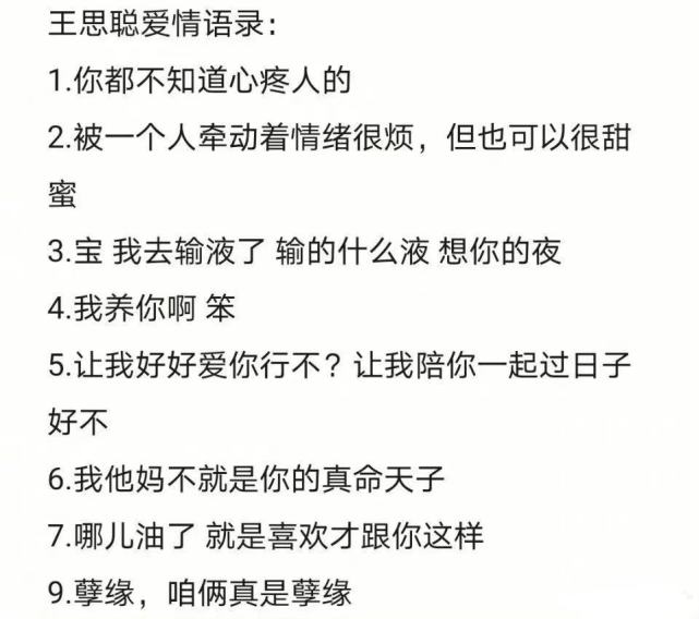聊天记录公开后,网友还总结出王思聪的「爱情语录」,成了网友们今日份快乐源泉,没想到「霸道总裁」王思聪也有这样柔情的一面。
