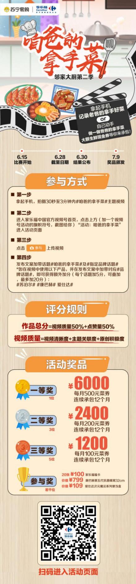 据悉,本次比赛于6月15日开始,参赛者通过手机拍摄30秒至3分钟#咱爸的拿手菜#主题视频,同时将视频上传至家乐福中国官方视频活动页面即为参赛成功。不同于上次,此次比赛评分规则采取的是视频质量和点赞量各占50%,厨艺不精的参赛者,可以考虑在视频文案中附加#苏泊尔##康巴赫##爱仕达#产品话题,可以额外加分呢。