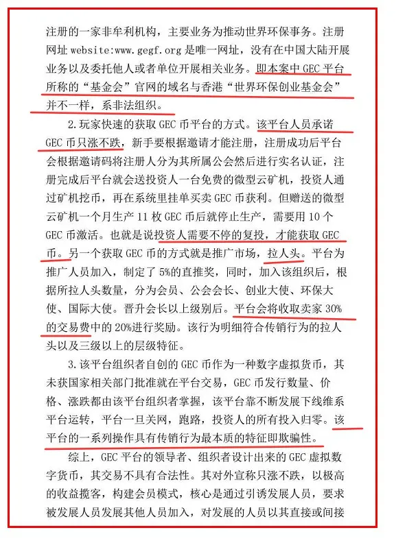 判定书里也详细讲解了GEC环保币为何是传销!业内专家指出,环保币基本上可以归为盘圈。盘圈外观是虚拟货币,内核为资金盘,前人的收益来源于后来者的资金。该模式不仅涉嫌变相ICO,而且拉人头模式涉嫌传销。