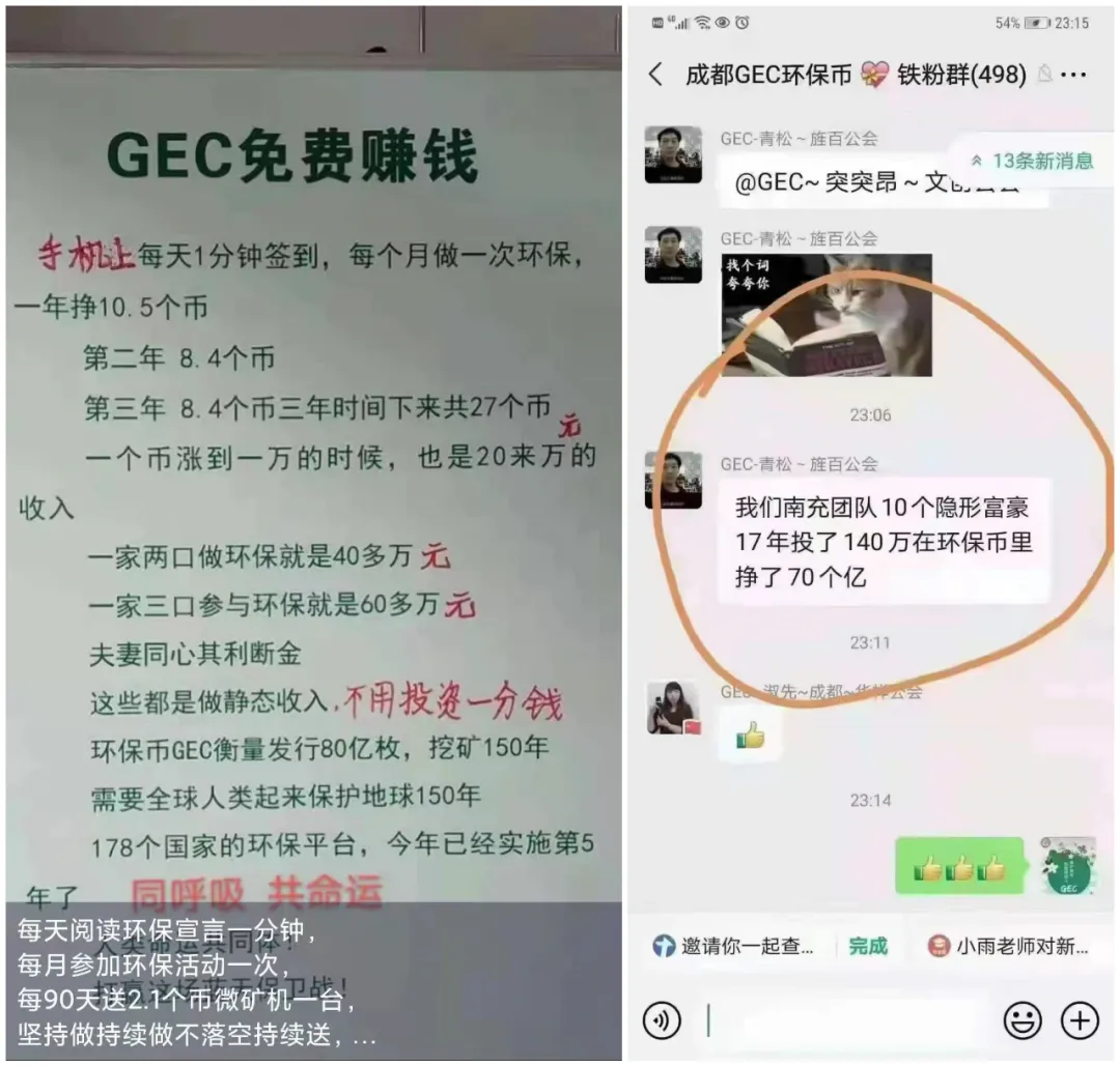 你真觉得GEC能带你赚钱么?如果能轻轻松松赚了70个亿,还轮到别人去分一杯羹么?还这么费劲儿在群里吆喝么?如果真的不用投资一分钱,那些“偷家里的金镯子卖钱买币”、“儿子、女儿、弟弟等全家人的信用卡一起套现买币”......的朋友圈在干嘛?