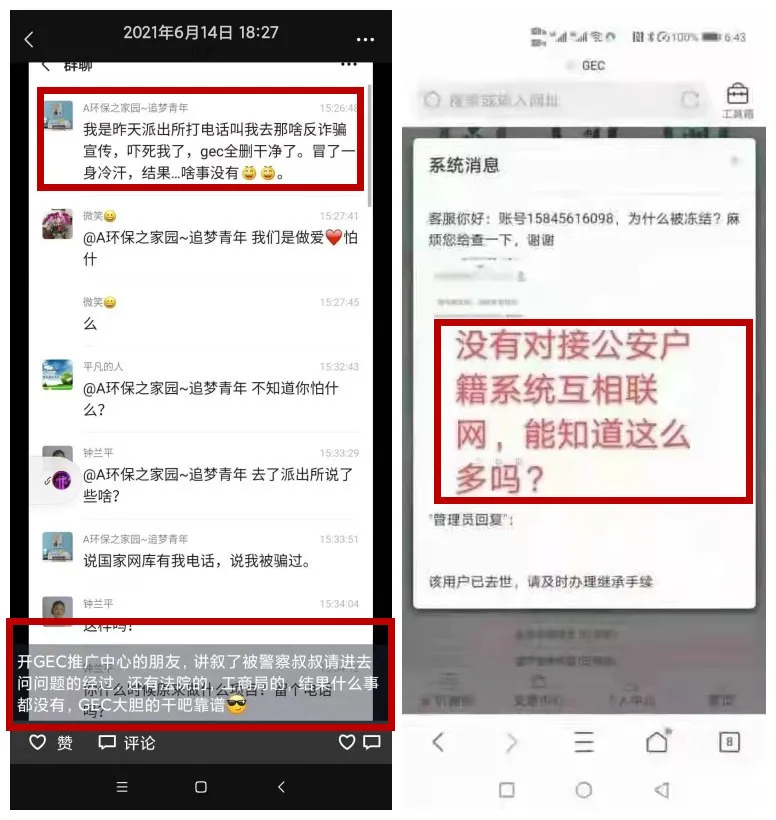 虽然核心成员已落网,但还有一些传销人员在朋友圈、社群里活动。近期,已经有警察陆续找到相关参与人员问话。但他们在躲过一劫后,继续鼓吹“GEC靠谱”!这种操作真是害人又害己!