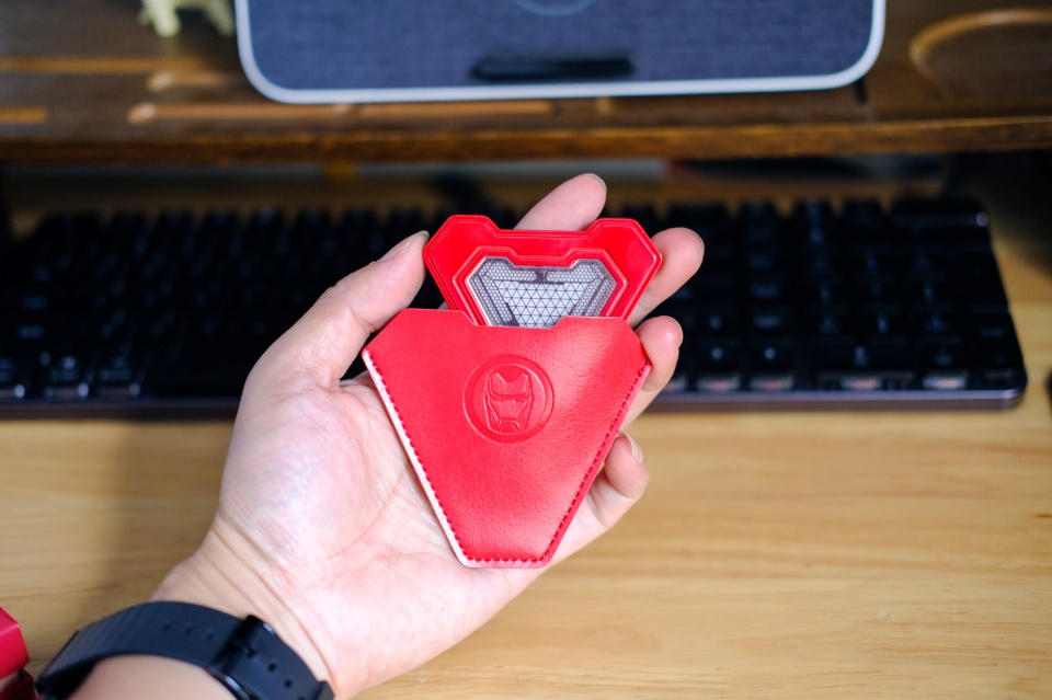 收纳袋采用皮质设计,红色配色,也镶印着钢铁侠的标识。平时外出携带,能够比较好地保护移动硬盘不受损伤。