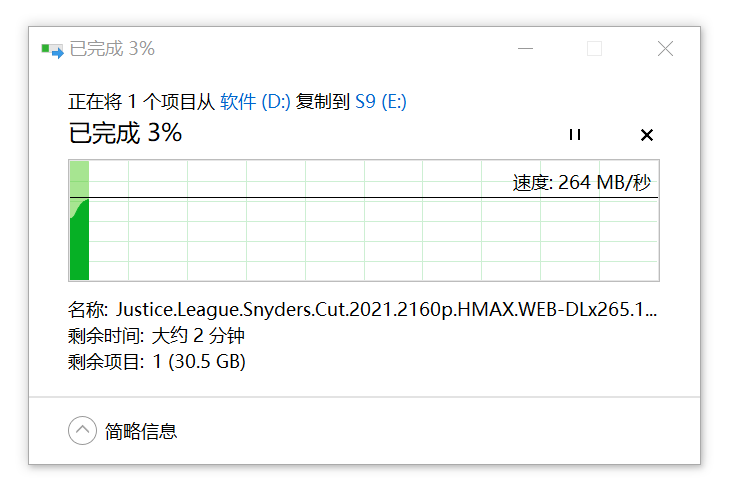 从电脑上拷贝一片容量为31.5GB的电影,速度几乎保持在270MB/s左右,传输完毕用时差不多2分钟。这样的速度,你们觉得怎么样?