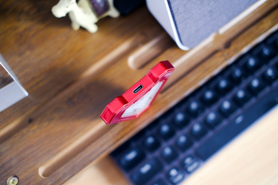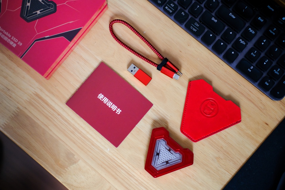 打开包装,我们可以看到这个移动固态硬盘很夸张地采用了核反应堆的造型。包装之内,配件还包括:一个收纳袋,一根同样采用红黑元素的编制双Type-c数据线,一个标准USB转Type-C的转接头,还有一份使用说明书。