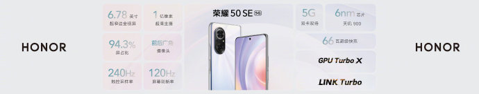 荣耀 50 SE 搭载了联发科天玑 900 处理器,采用 6.78 英寸 1.1mm 超窄边框 120Hz 直屏,搭载 1 亿像素超清主摄,同时支持 66 瓦超级快充,20 分钟即可充 75% 电量。同样搭载 GPU Turbo X、LINK Turbo 技术,让你体验丝滑流畅。流光幻镜、魅海蓝、亮黑色三种配色可选。