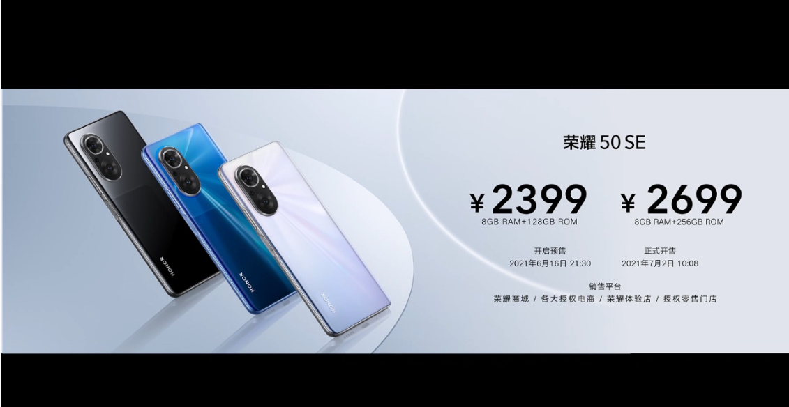 荣耀 50 SE 手机:8GB+128GB 售价 2399 元,8GB+256GB 售价 2699 元。