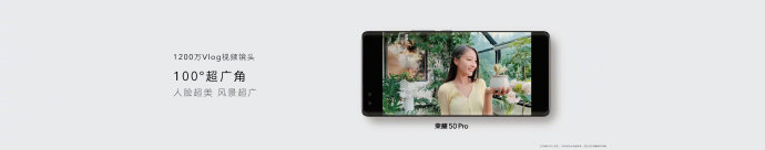荣耀 50 Pro 对 Vlog 视频拍摄功能进行了多种优化,前置 3200 万像素自拍镜头、1200 万像素 Vlog 视频镜头。此外,后置主摄达 1 亿像素。
