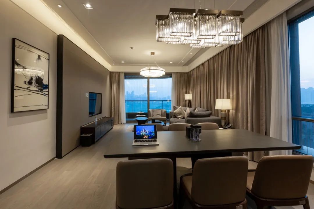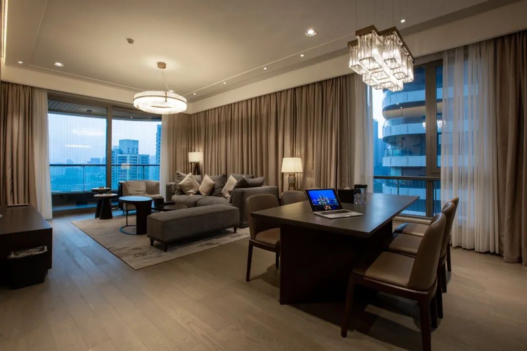房间配备有宽敞的客厅和独立的用餐区域,可以在餐桌上办公,可以慵懒地躺在沙发上刷手机,也可以前往宽大的阳台欣赏壮美的城市夜景。