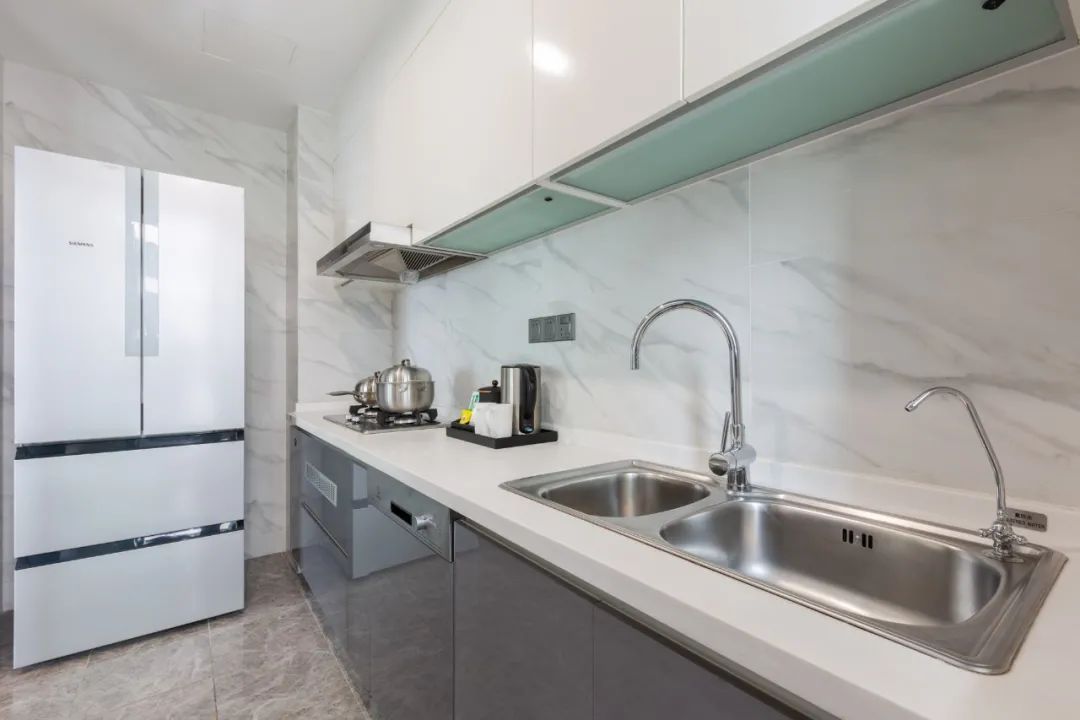 公寓宽敞整洁的厨房,配备有嵌入式洗碗机,饮用水净化器。如果是多人入住,还可以在房间里煮火锅,而宽大的双开冰箱恰好可以装各种肉类蔬菜和酒水饮料。