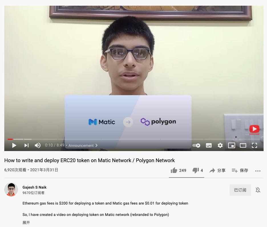 部署在ETH智能合约Gas费需要花费 200 美元,而在Matic上部署智能合约Gas费仅需要0.01 美元。这位少年对着镜头认真的与全世界分享说道。如果不说年龄,没有人知道他是个仅仅才13岁的印度初中生。