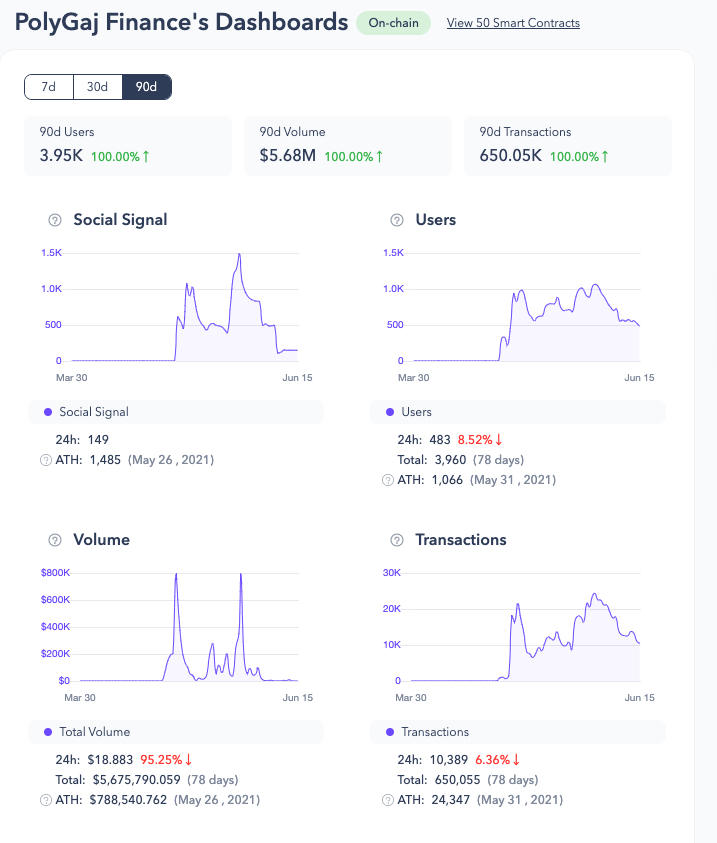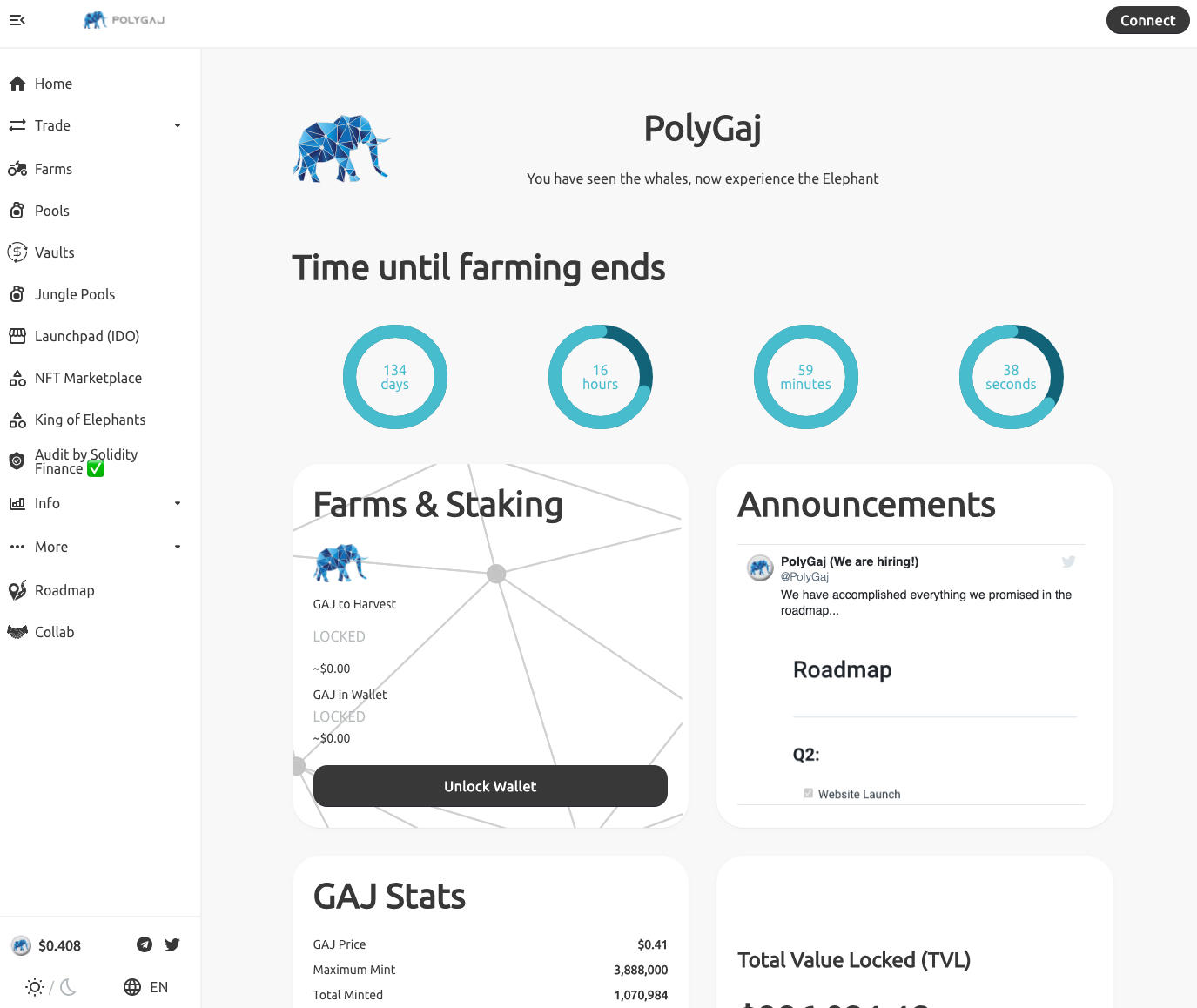 PolyGaj是一个建立在 Polygon链上的DeFi协议。 最初PolyGaj只是BSC链上Goose Finance的仿盘(fork),随着不断优化,目前已正常运行79天,总流动资金已达500万美金。