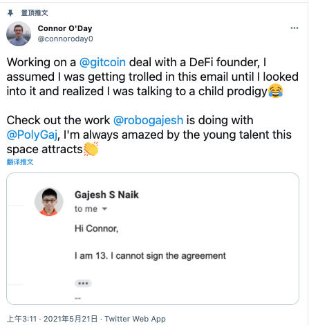 “在与一位DeFi创始人打交道时,我以为我在这封电子邮件中被骗了,直到我仔细查确认后,才意识到我在和一个神童在交谈。”(13岁少年因未成年不能签确认书)
